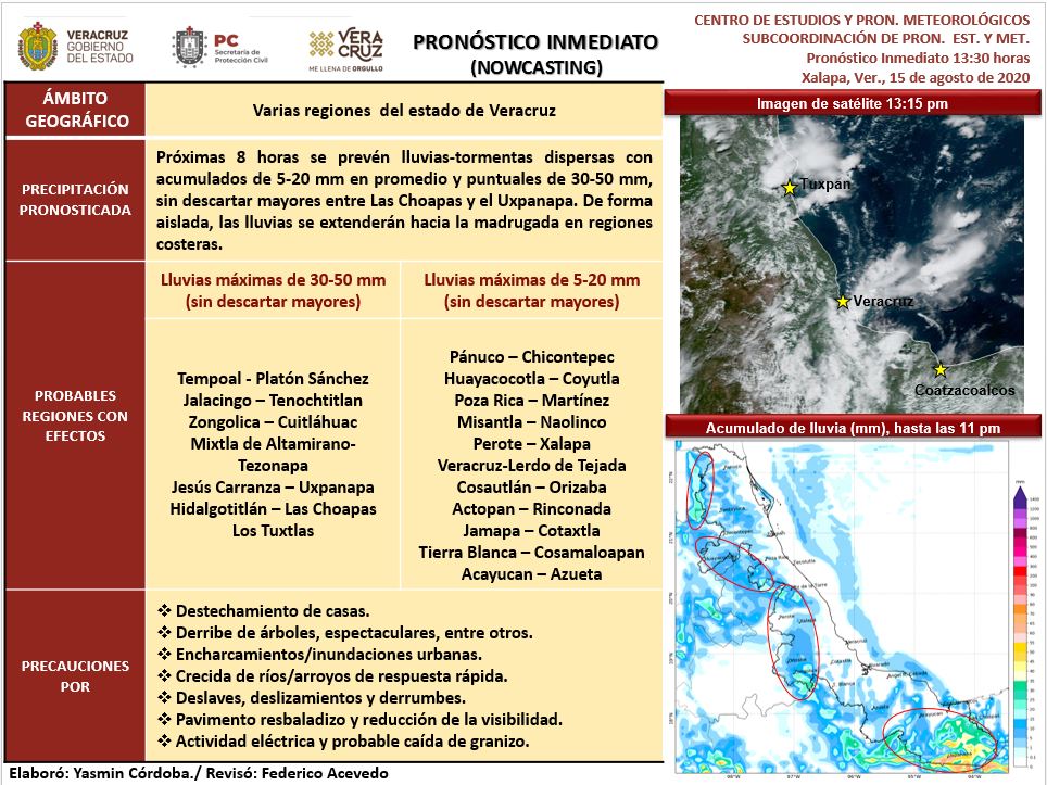 Tal situación apoya el tiempo favorable para lluvias y tormentas eléctricas por la tarde en regiones de montaña y zona sur, con acumulados de 5 a 20 mm y puntuales de 30 a 50 mm. No se descarta mayores de 70 mm de forma dispersa hacia el Uxpanapa, principalmente por la noche y madrugada.