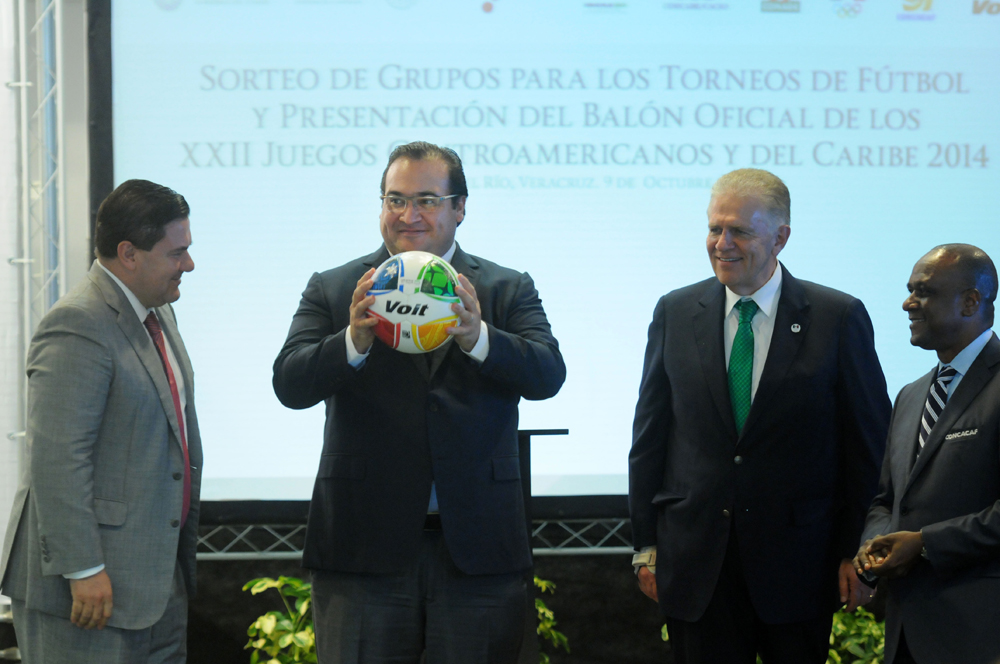 Veracruz, Ver.- Con el sorteo de grupos para los torneos varonil y femenil de futbol que competirán en los Juegos Deportivos Centroamericanos y del Caribe (JCC) Veracruz 2014, el gobernador Javier Duarte de Ochoa presentó este jueves el balón oficial de la gran justa deportiva que inicia en 36 días, el cual diseñó el Grupo Voit.