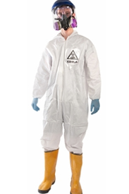 La vestimenta consta de una mono blanco con una pegatina en la que se puede leer palabra “ébola'', máscara de oxígeno, gafas de seguridad y guantes de látex azules.