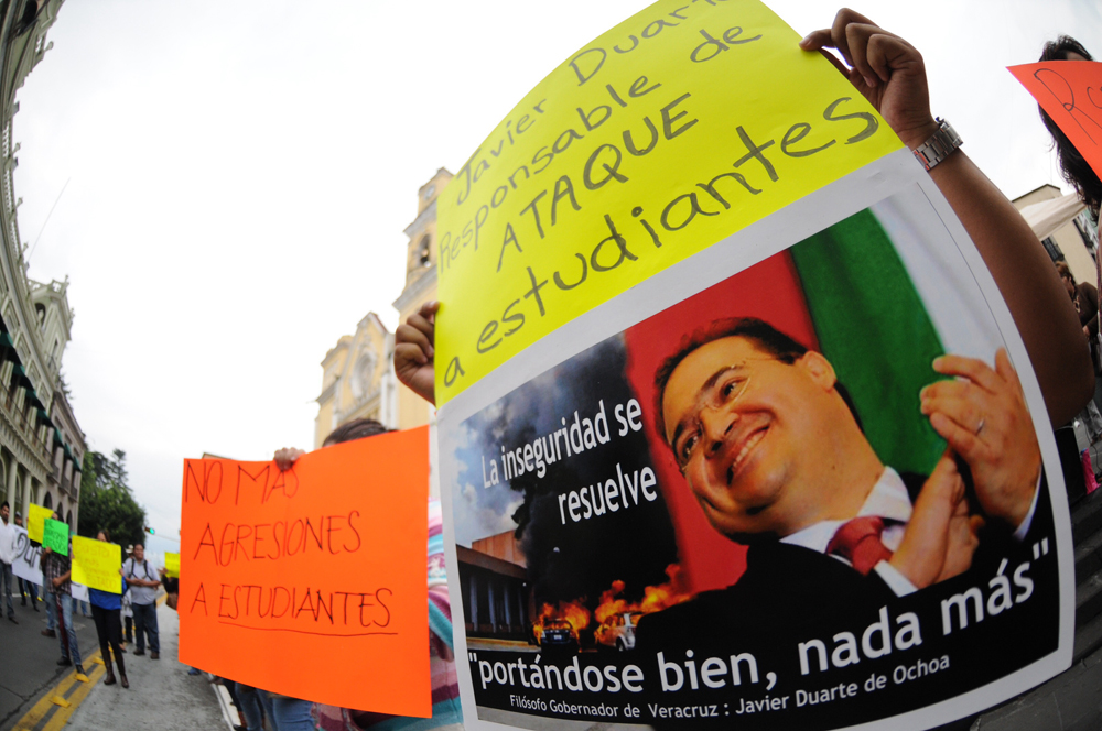 Xalapa, Ver.- Maestros y estudiantes se manifestaron frente a palacio de gobierno por casi dos horas para exigir justicia en el caso de los ocho jóvenes agredidos por encapuchados durante la madrugada de este viernes.