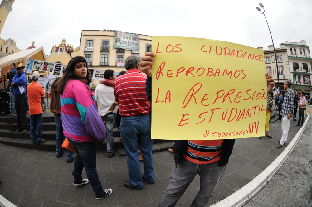 Con mantas, carteles y un tendedero político, maestros de la Universidad Veracruzana (UV), y del Movimiento Magisterial Popular Veracruzano (MMPV), también exigieron freno a la criminalización de la protesta y a los hechos de violencia.