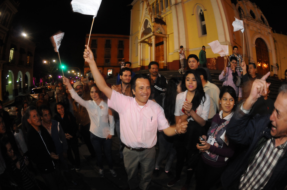Xalapa, Ver.- A las 11:00 de la noche Cuitláhuac García, candidato por el Movimiento de Regeneración Nacional (Morena) llegó a festejar a la Plaza Lerdo su triunfo a la diputación federal por el distrito 10 de Xalapa urbano, mientras alrededor de 50 personas lo acompañaban al grito de “¿A dónde están, esos priístas que nos iban a ganar?”.