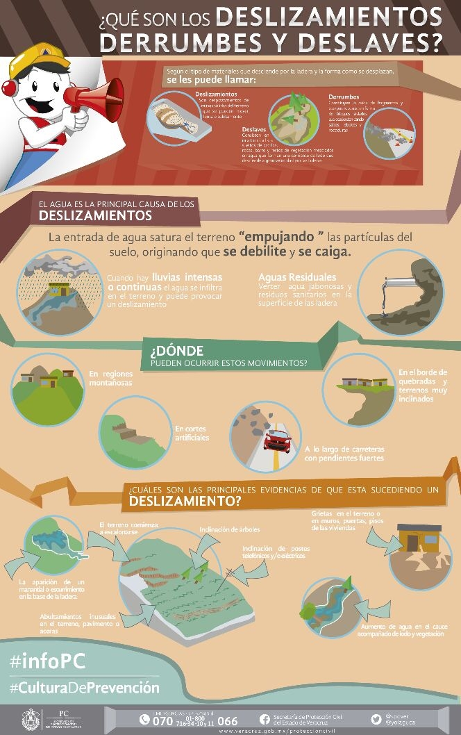 De igual forma, expuso que se registraron 14 deslaves, derrumbes y deslizamientos, los cuales no provocaron mayores daños y sólo interrumpieron la circulación en algunas vías de comunicación; estos eventos geológicos se presentaron en: Coatepec, Naranjal (con cinco), Papantla, Tequila (dos), Tlaltetela, Tlilapan (tres) y Zongolica.