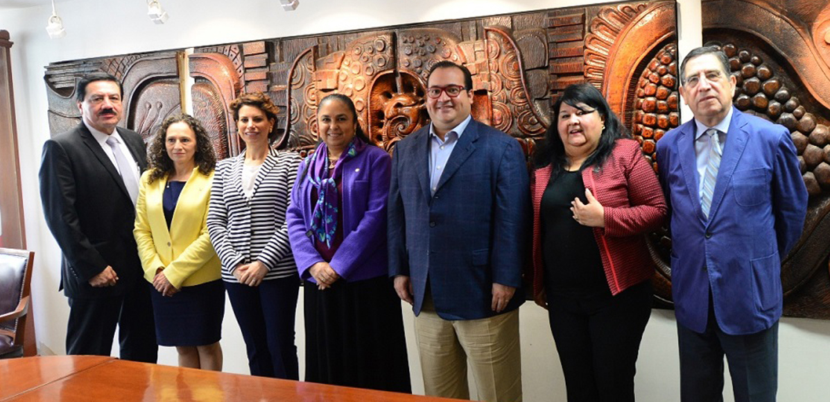 En la UV, en Sala de Juntas, fue recibido por Ladrón de Guevara, Octavio Ochoa, secretario de la Rectoría UV; Leticia Rodriguez Audirac, Clementina Guerrero, Secretaria de Finanzas.