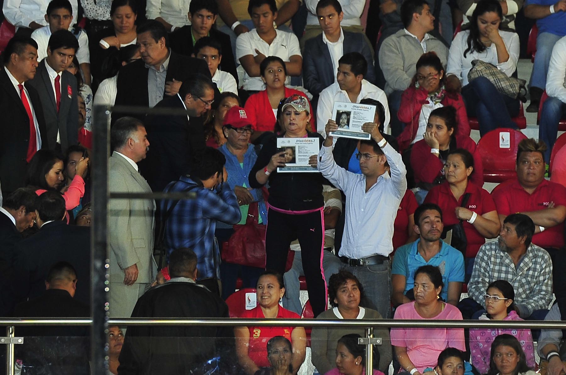 Cinco minutos llevaba Javier Duarte hablando de los logros de su gobierno, cuando los integrante del Colectivo por la Paz Región Xalapa desplegaron dos lonas con los rostros de desaparecidos.