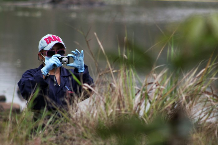 Mientras se comenzó la búsqueda en la tierra que rodea la laguna donde cada tanto los peritos se agachaban y parecían reportar pequeños hallazgos a uno de sus supervisores.