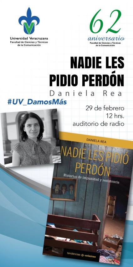 La periodista Daniela Rea presentará el libro “Nadie les pidió perdón. Historias de impunidad y resistencias” el lunes 29 de febrero a las 12:00 horas, en el auditorio de radio de la Facultad de Ciencias de la Comunicación de la Universidad Veracruzana (UV).