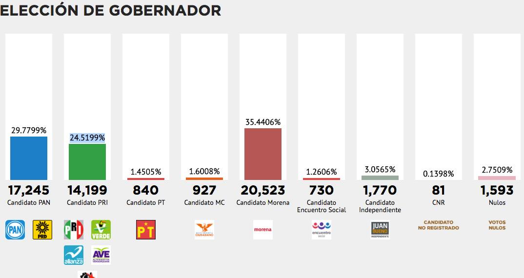A las 22:00 horas, con poco más de 300 actas computadas, Morena se encontraba en el primer lugar, con 35.4406 por ciento de las preferencias, en segundo lugar la alianza PAN-PRD, con el 29.7799 por ciento de los votos, y en tercer lugar el PRI, con el 24.5199 por ciento de las preferencias.