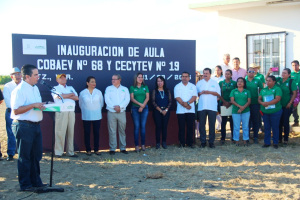 En este lugar inauguró cuatro aulas: dos para el Cobaev 68 y dos para el Cecytev 19; realizadas gracias al trabajo coordinado entre el Gobierno Municipal, Grupo Roma, y la Fundación Asunta Coelis, asociación civil que a través del “Segundo Sorteo por la Educación”, recaudó fondos para la iniciación de ambos bachilleres; además otorgó 150 sillas escolares al Cobaev 68.