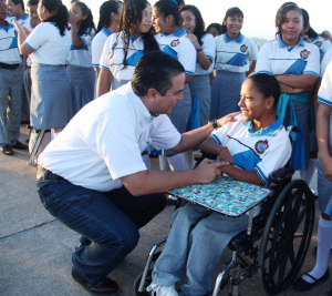 En la Secundaria General 7, ubicada en Dunas, el director Gabriel Torres Marcos y la alumna Frida Elizabeth Gutiérrez Salas, lo reconocieron como fundador de este proyecto: “desde antes de convertirse en mandatario municipal, gestionó la salida de aguas pluviales; y ahora en su calidad de presidente, instaló un transformador y dio solución a la problemática con la CFE.”