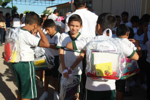 Además repartieron mochilas y paquetes de útiles escolares que incluyen libretas, colores, juego de geometría y lapicera.
