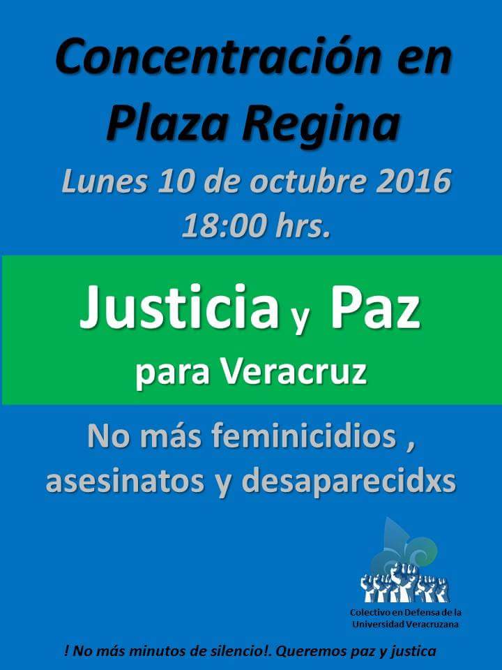 En Xalapa, se ha llamado a una concentración en la Plaza Regina –Lerdo-, a las 18:00 horas.