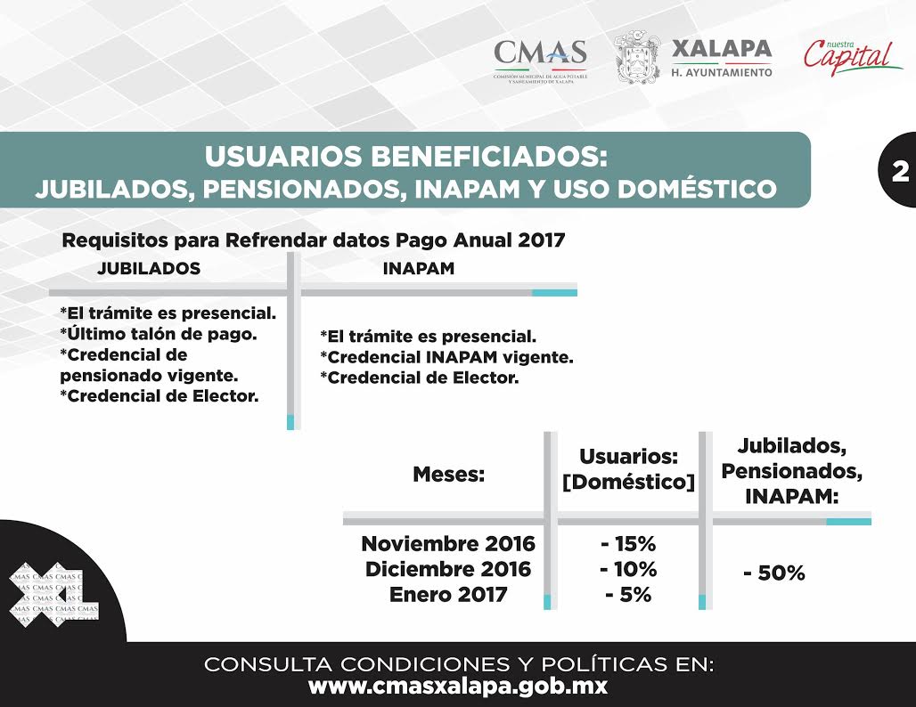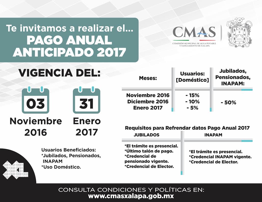 Los requisitos y políticas para el Pago Anual Anticipado pueden ser consultados en las oficinas, en la página web oficial: www.cmasxalapa.gob.mx o en las redes sociales oficiales del organismo operador en Twitter: @CMAS_Xalapa y en Facebook: //CMAS-Xalapa.