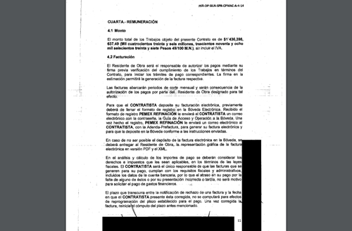 En el contrato Pemex se comprometió a dar un anticipo del 20 por ciento, es decir, 287 millones 279 mil 727 pesos con 50 centavos (sin IVA) para instalaciones temporales, movimientos y traslado de maquinaria al sitio.