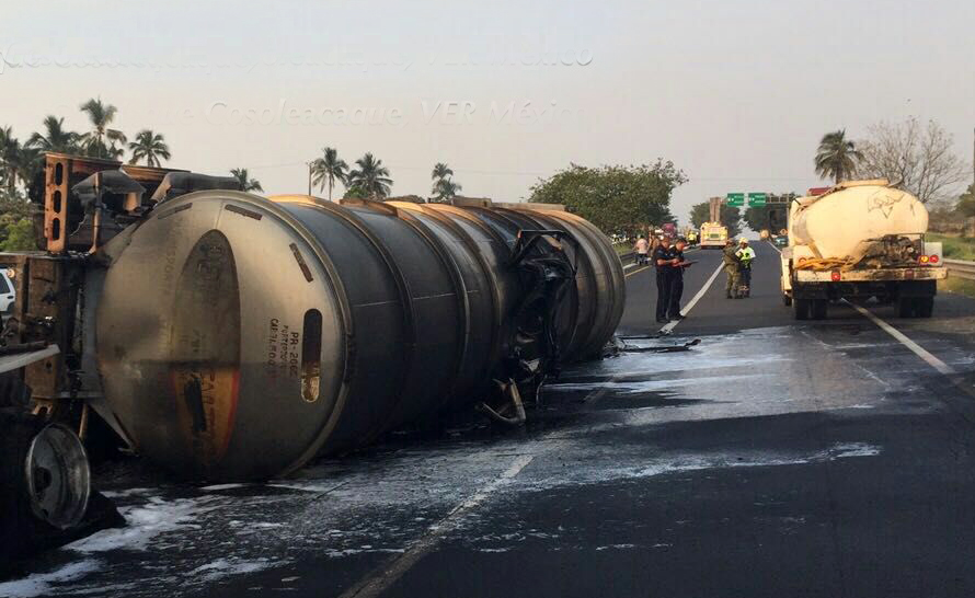 Minatitlan, Ver.- Una pipa cargada con combustible se incendió este martes por la mañana sobre la autopista Nuevo Teapa-Cosoleacaque, al sur de la entidad.
