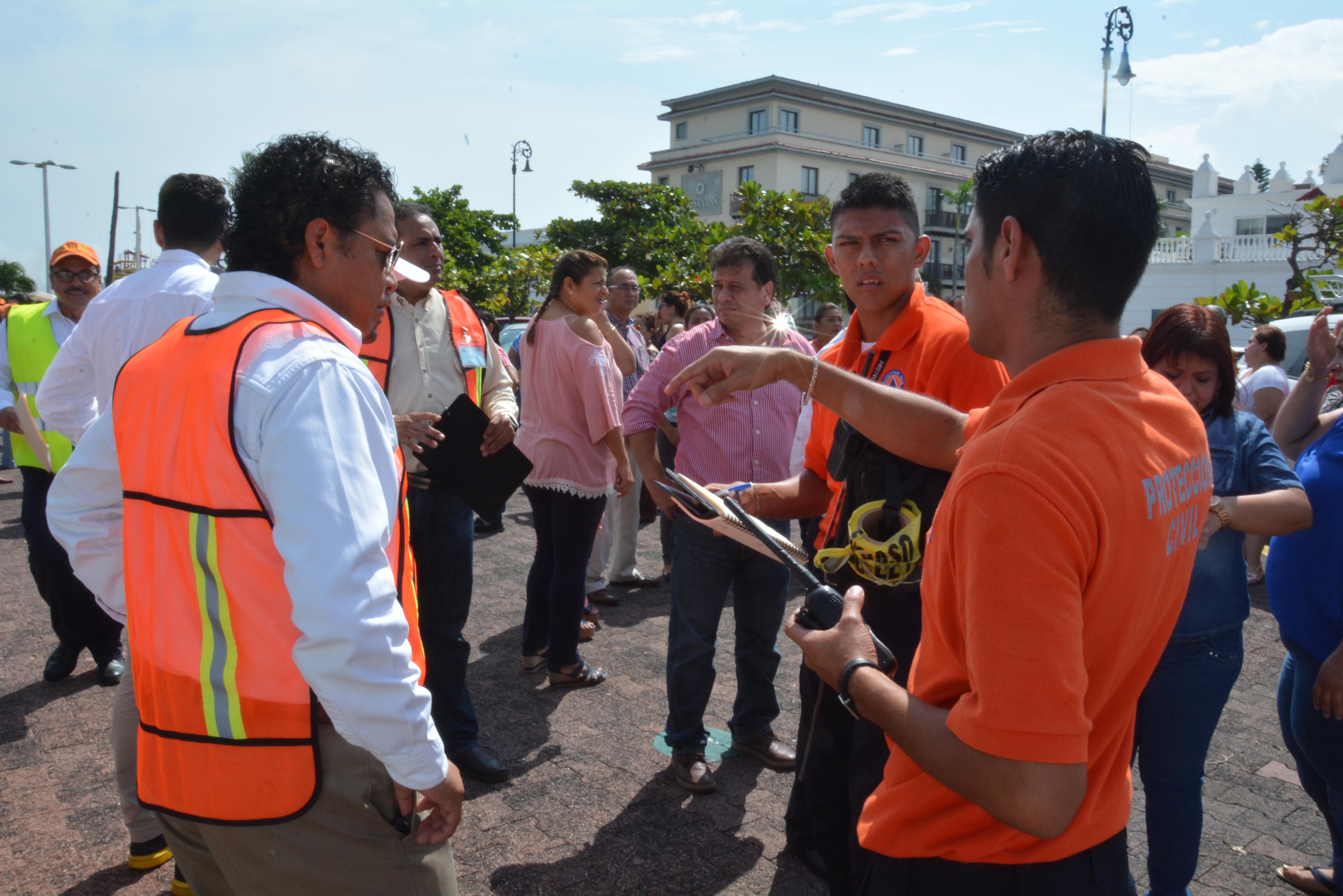 Después, el Director de PC en el municipio, Adolfo Zugasti Cueva, acompañado del Jefe de Seguridad de la Gerencia de Transporte Marítimo de PEMEX, Fernando Cervantes, encabezó el simulacro realizado en la Torre de Pemex, en donde en un tiempo de cuatro minutos se llevó a cabo la evacuación de 203 personas coordinadas también por 19 trabajadores de Protección Civil y Bomberos de este puerto.