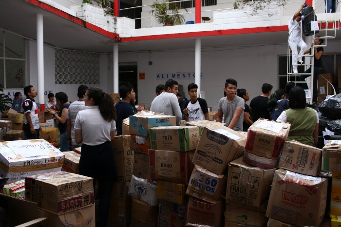 Xalapa, Ver.- Más de un centenar de manos se mueven a prisa, ordenan los alimentos enlatados, los separan de los productos para la higiene personal, y otro tanto de igual número de brazos cargan las cajas selladas con cinta adhesiva, etiquetadas y listas para ser enviadas a las oficinas centrales de Cruz Roja en México.