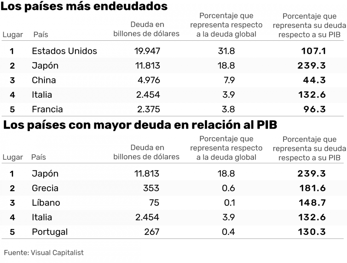La información retomada por Visual Capitalist quien la hizo gráfico, señala que Estados Unidos, la economía más grande del mundo, lidera la lista de los 5 países más endeudados, con casi 20 billones de dólares (bdd).