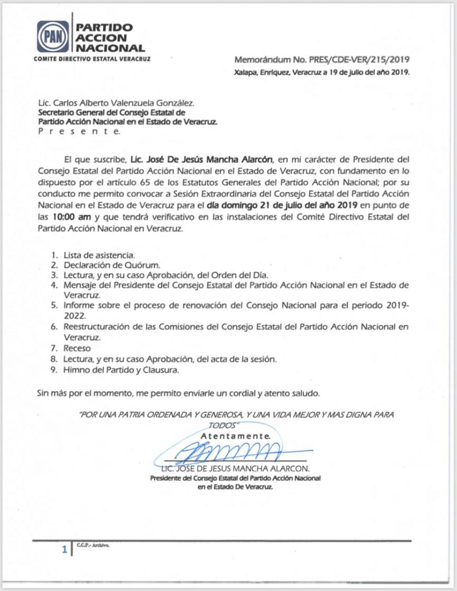 El pasado viernes 19 de julio José Mancha Alarcón emitió la convocatoria a una reunión extraordinaria del Consejo Político Estatal para el domingo 21 de junio.