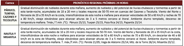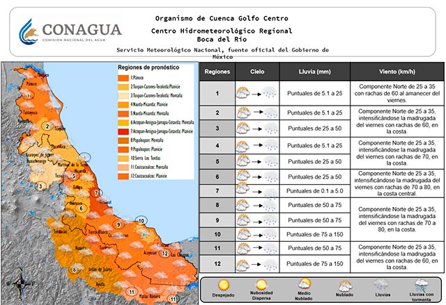Durante la primera mitad del día se espera la disminución gradual de nublados, periodos de sol t ligera recuperación de la temperatura diurna, sin embargo, la tarde-noche del jueves y el viernes se prevé un aumento en la posibilidad de precipitaciones y tormentas por la llegada del FF #13 a territorio veracruzano.