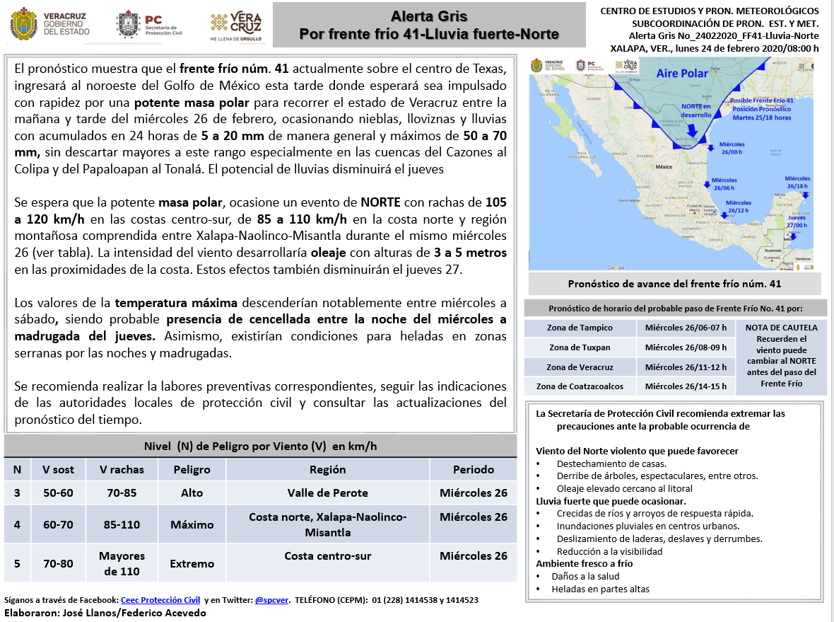 Xalapa, Ver.- Protección Civil Estatal (PC) activó la Alerta Gris por la llegada de Frente Frío #41, actualmente ubicado en el centro de Texas ingresará durante esta tarde, sus efectos se sentirán con fuerza a partir del próximo miércoles.