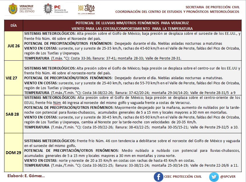 La surada podría traer probables rachas de 65 a 90 Km/h en la parte alta de Perote, Orizaba, región de los Tuxtlas y cuenca baja del Coatzacoalcos.