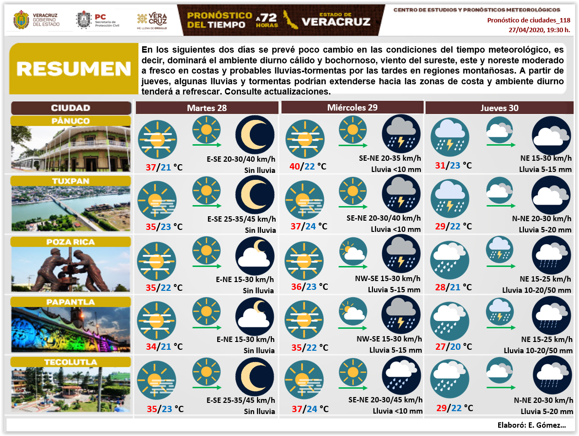 Xalapa, Ver.- De acuerdo con los pronósticos meteorológicos de Protección Civil, este martes y miércoles serán calurosos con temperaturas de hasta 40°C o superiores en zonas de planicie.