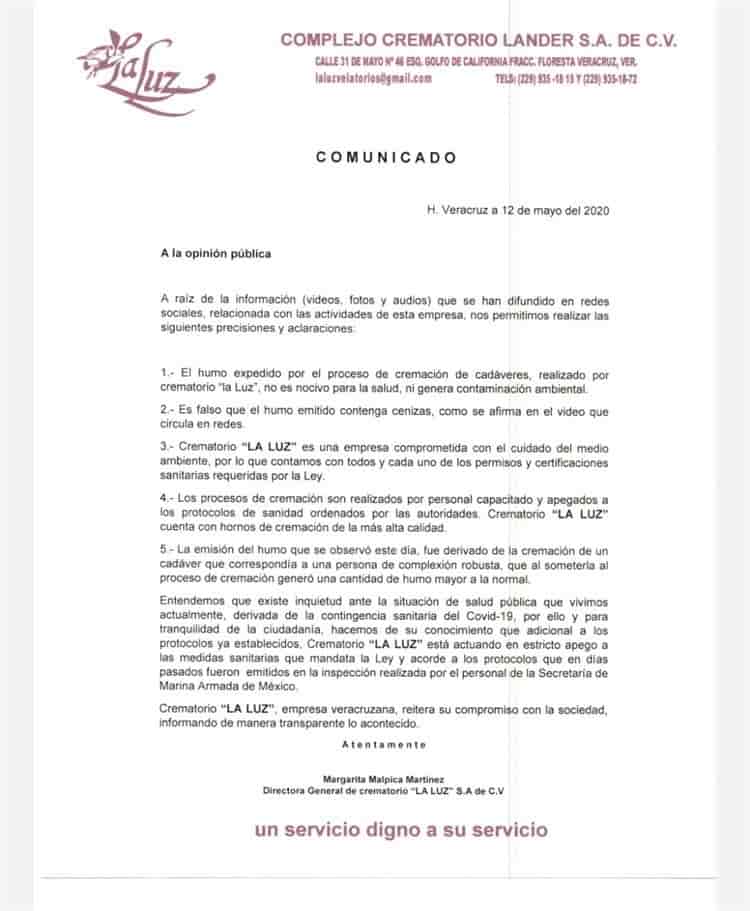 La empresa, de razón social Velatorios La Luz S.A. de C.V. dijo que el humo expedido por el proceso de cremación de cadáveres no es nocivo para la salud pública, ni genera contaminación ambiental, ni se generó caída de ceniza.