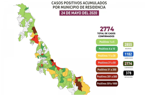 La Secretaría de Salud detalló que hasta las 19:00 horas del 24 de mayo estudió 6 mil 811 pacientes con síntomas de coronavirus, de los cuales 2 mil 855 resultaron negativos, además mil 182 sospechosos de 96 municipios continúan en investigación.