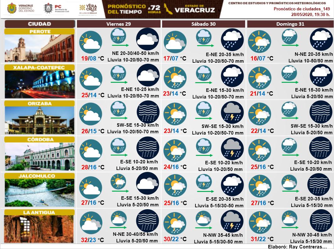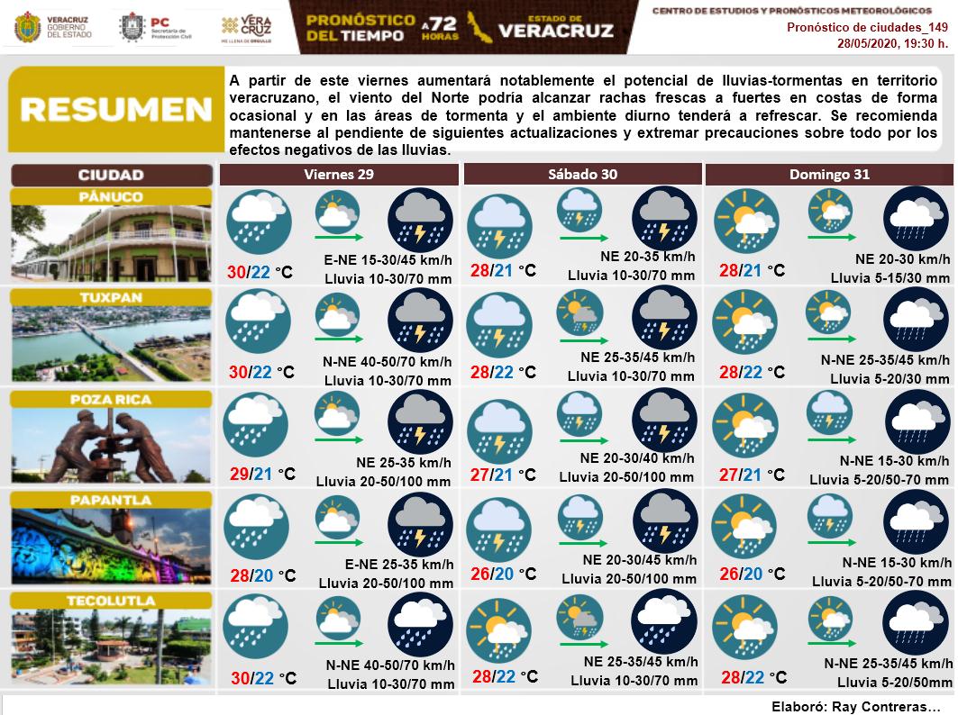 Xalapa, Ver.- Vientos del norte con rachas que podrían alcanzar los 70 km/h y condiciones para lluvias y tormentas eléctricas predominarán este viernes 29 de mayo en Veracruz, de acuerdo con el meteorólogo de la Secretaría de Protección Civil del estado, Federico Acevedo Rosas.