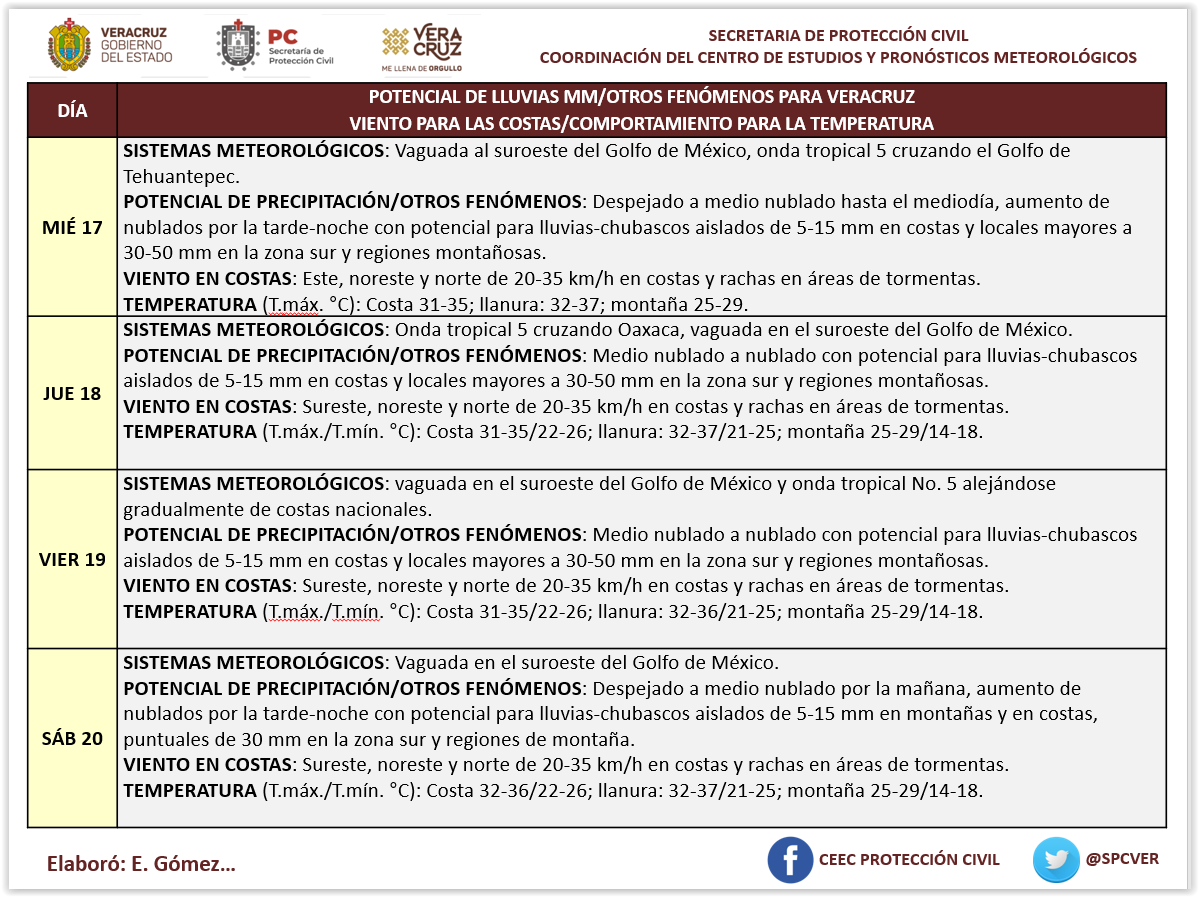 Xalapa, Ver.- Los próximos 3 días se pronóstico la presencia de lluvias y tormentas aisladas en el sur de Veracruz y en zonas montañosas por la presencia de la Onda Tropical #5 y de una vaguada al suroeste del Golfo de México.