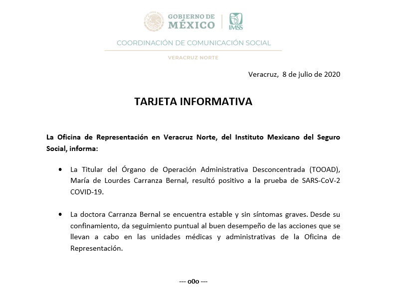 A través de un breve comunicado, el IMSS detalló que la titular del Órgano de Operación Administrativa Desconcentrada en la delegación Veracruz-Norte, dio positivo a la prueba de SARS-CoV-2.