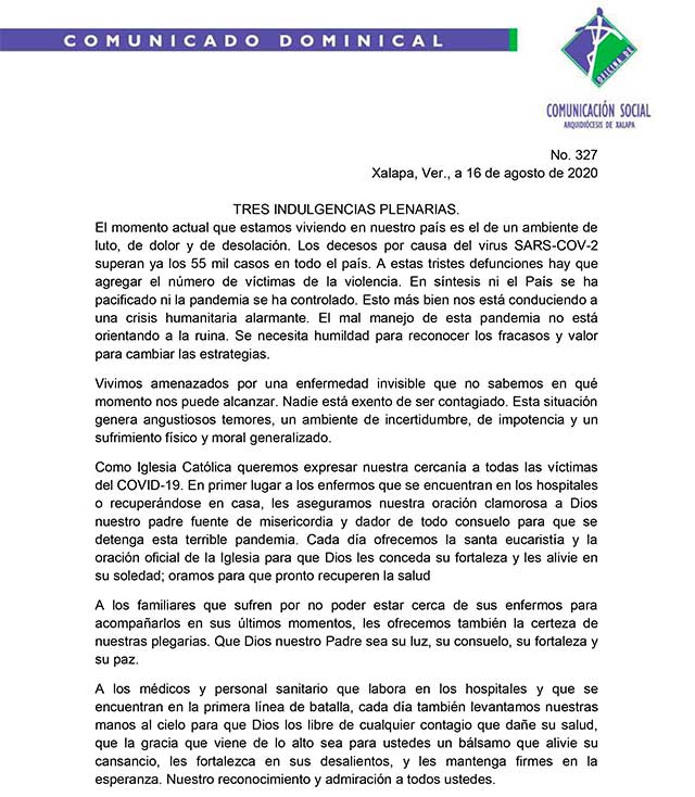Xalapa, Ver.- La Arquidiócesis de Xalapa advirtió que el mal manejo de la actual pandemia de covid-19 “nos está orientando a la ruina”.