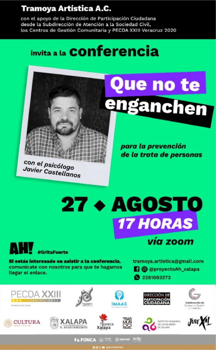 Xalapa, Ver.- Para generar un diálogo social, promover la participación activa de la comunidad y trabajar en favor de la prevención de la trata de personas, el Ayuntamiento de Xalapa, a través de la Dirección de Participación Ciudadana, apoya el Proyecto Ah! #GritaFuerte No te enganches, mejor haz arte, iniciativa de la asociación civil Tramoya Artística, una de las 18 iniciativas ganadoras de la Tercera Convocatoria de Financiamiento Municipal de Proyectos Sociales.