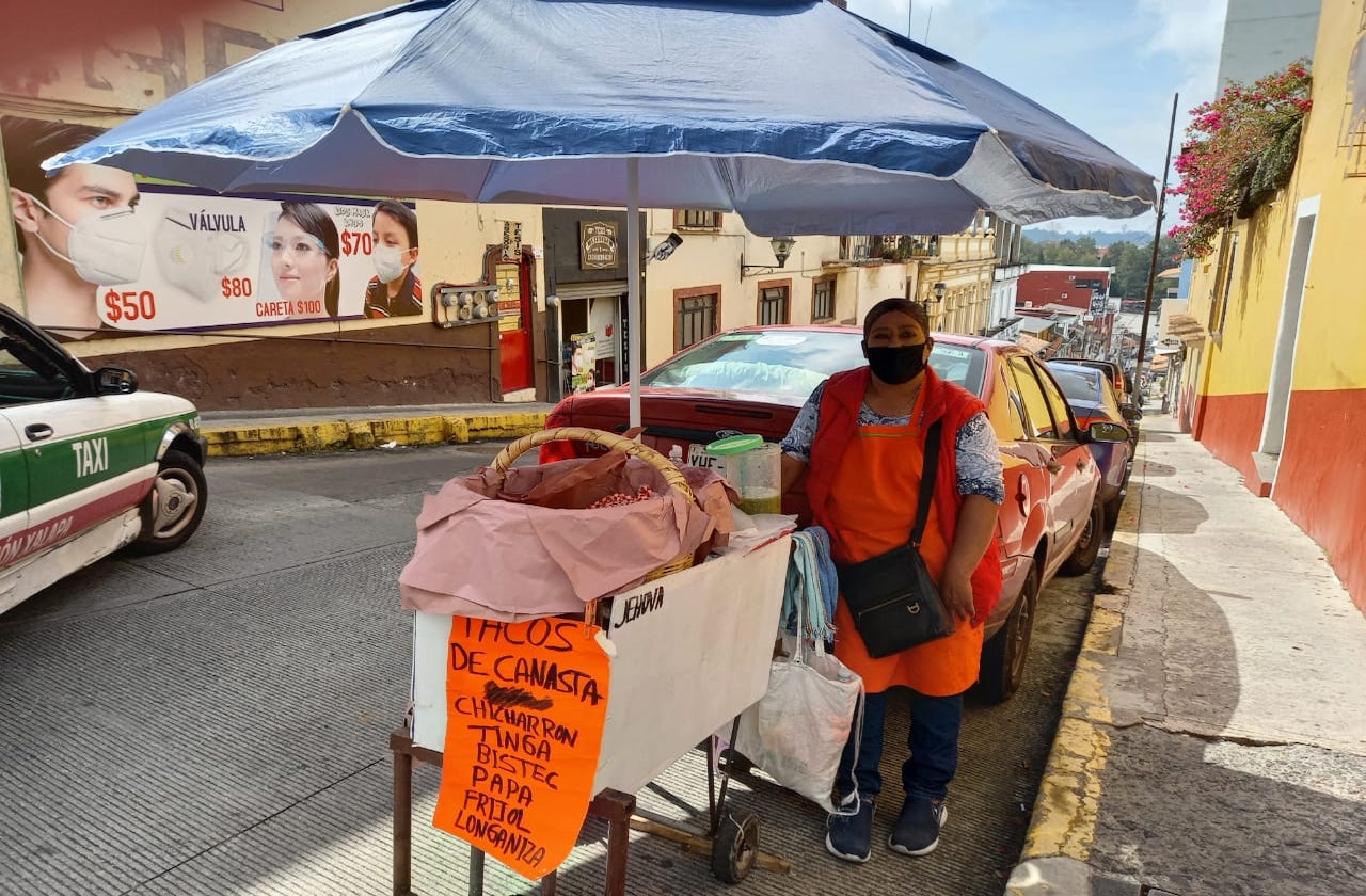 Xalapa, Ver.- Los clásicos tacos de canasta, ya sean de longaniza, bistec, frijol, papa, tinga y chicharrón, han permitido a doña Adriana subsistir a la pandemia. Desde que empezó la contingencia sanitaria ha trabajado en la esquina de Zaragoza y Sebastián Camacho, frente a la torre de Seguridad Pública y Palacio de Gobierno, para pagar los gastos de su casa y mantener a su familia.