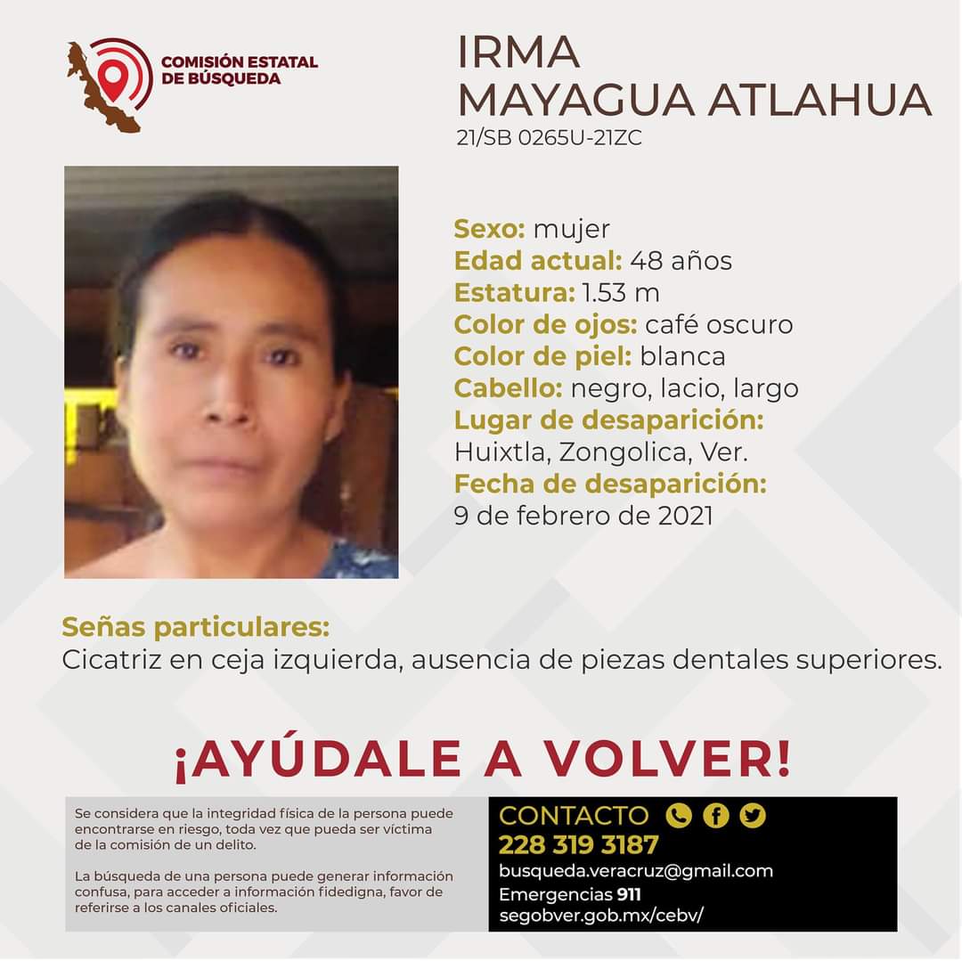 Fue el 9 de febrero del año en curso cuando la Comisión Estatal de Búsqueda emitió un boletín para dar con el paradero de Irma, mujer de 48 años de edad reportada como desaparecida en la localidad de Huixtla.