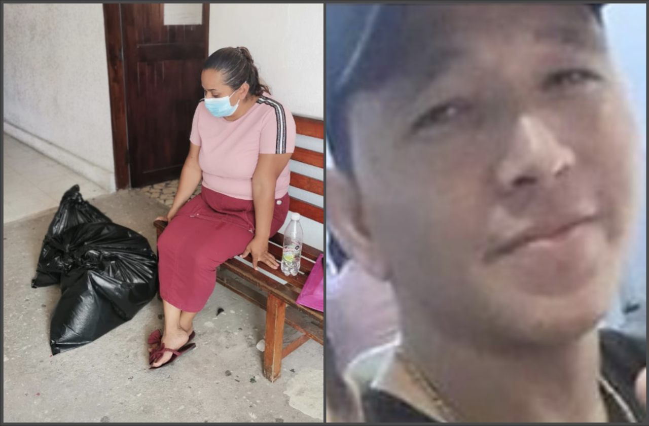La imagen fue retratada en un edificio de la Fiscalía General del Estado (FGE). Natalia reúne fuerzas desde una banca de madera para cargar dos bolsas negras donde autoridades le entregaron los restos de su hermano: Eladio Aguirre Chable, asesinado en Veracruz.
