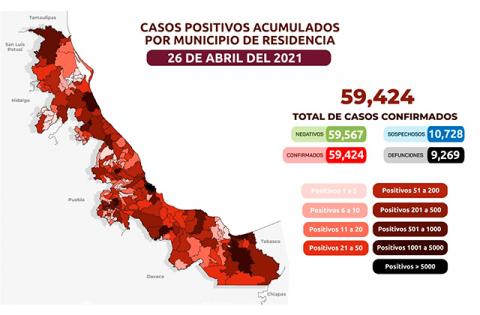Salud informó que hasta la noche de este lunes 26 de abril, la entidad veracruzana registra un total de 59 mil 424 casos positivos acumulados de covid-19, de los cuales 384 son casos activos actuales y 9 mil 269 defunciones.