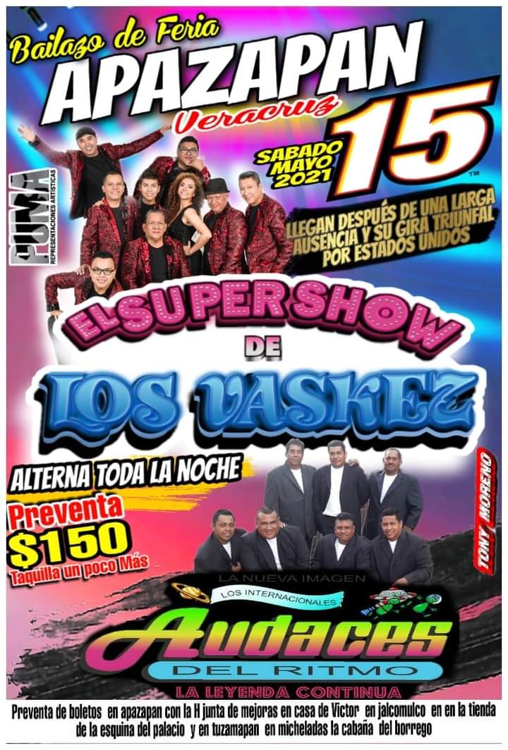 Con la invitación de un “Bailazo de Feria” para el sábado 15 de mayo, habitantes de Apazapan podrán disfrutar de los grupos El Super Show de Los Vaskez y Audaces del Ritmo.