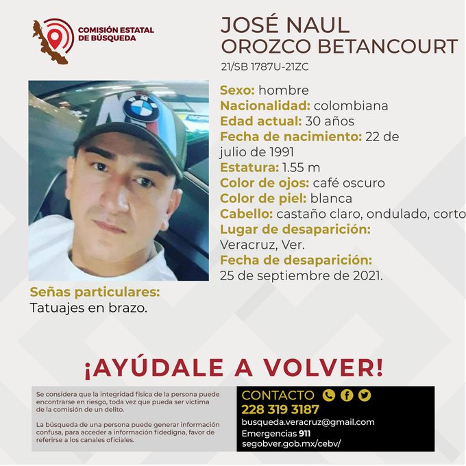 El joven de 30 años tiene nacionalidad colombiana. Por su desaparición la CEBVER levantó la ficha de búsqueda21/SB 1787U-21ZC.