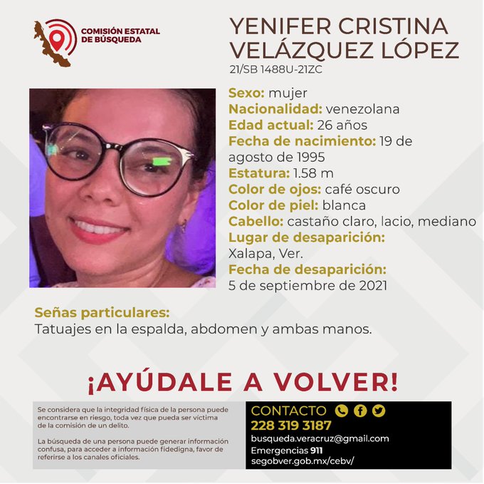 Yenifer Cristina Velázquez López es buscada desde el 5 de septiembre. La mujer de nacionalidad venezolana es buscada por sus familiares desde hace más de un mes.