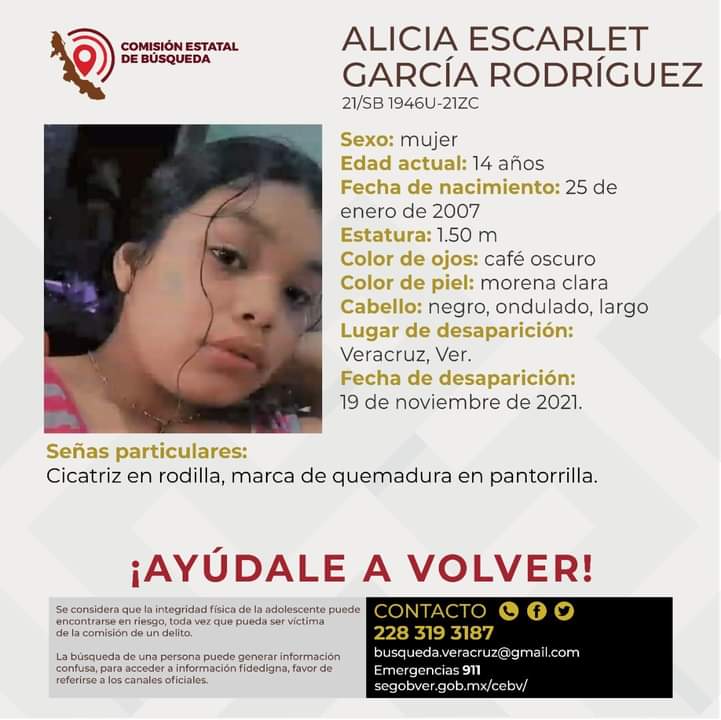 Veracruz, Ver.- Alicia Escarlet García Rodríguez, de 14 años fue reportada como desaparecida el día 19 noviembre, en el puerto de Veracruz.
