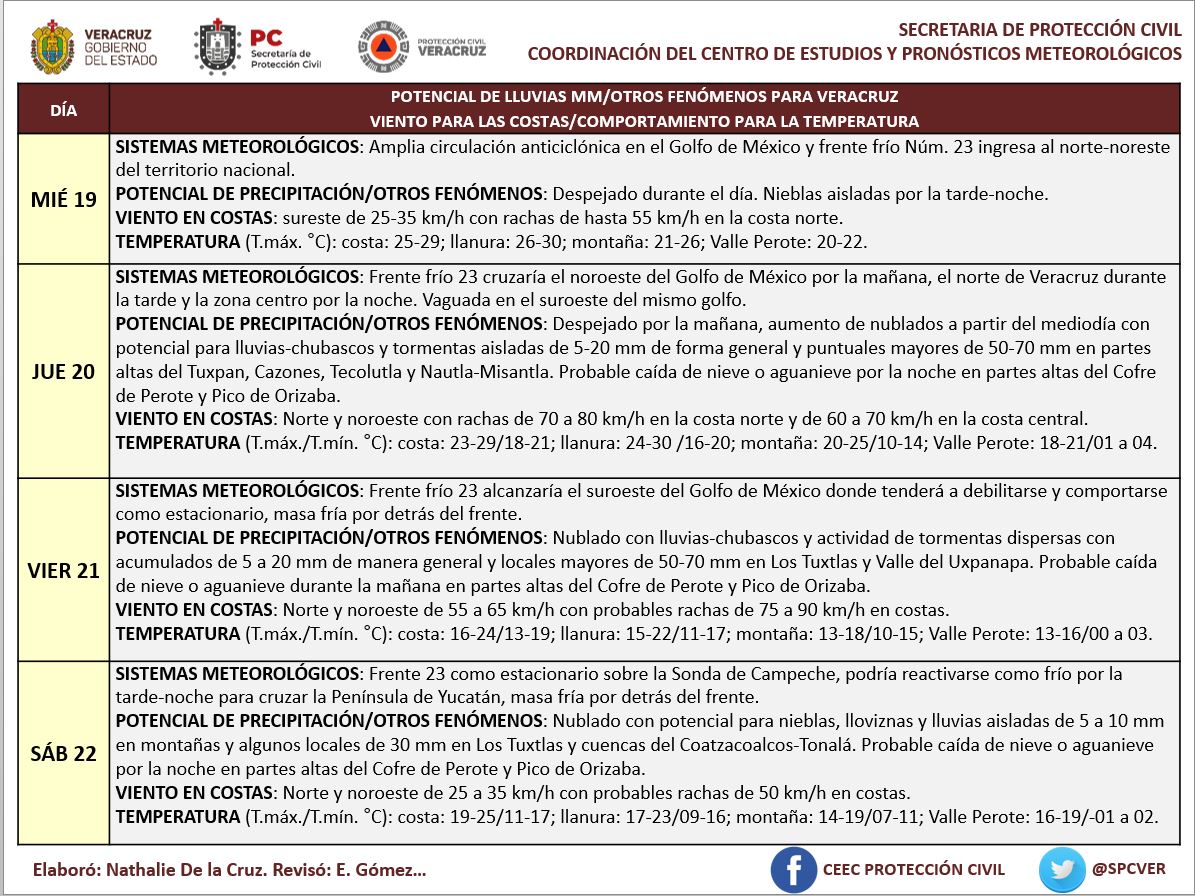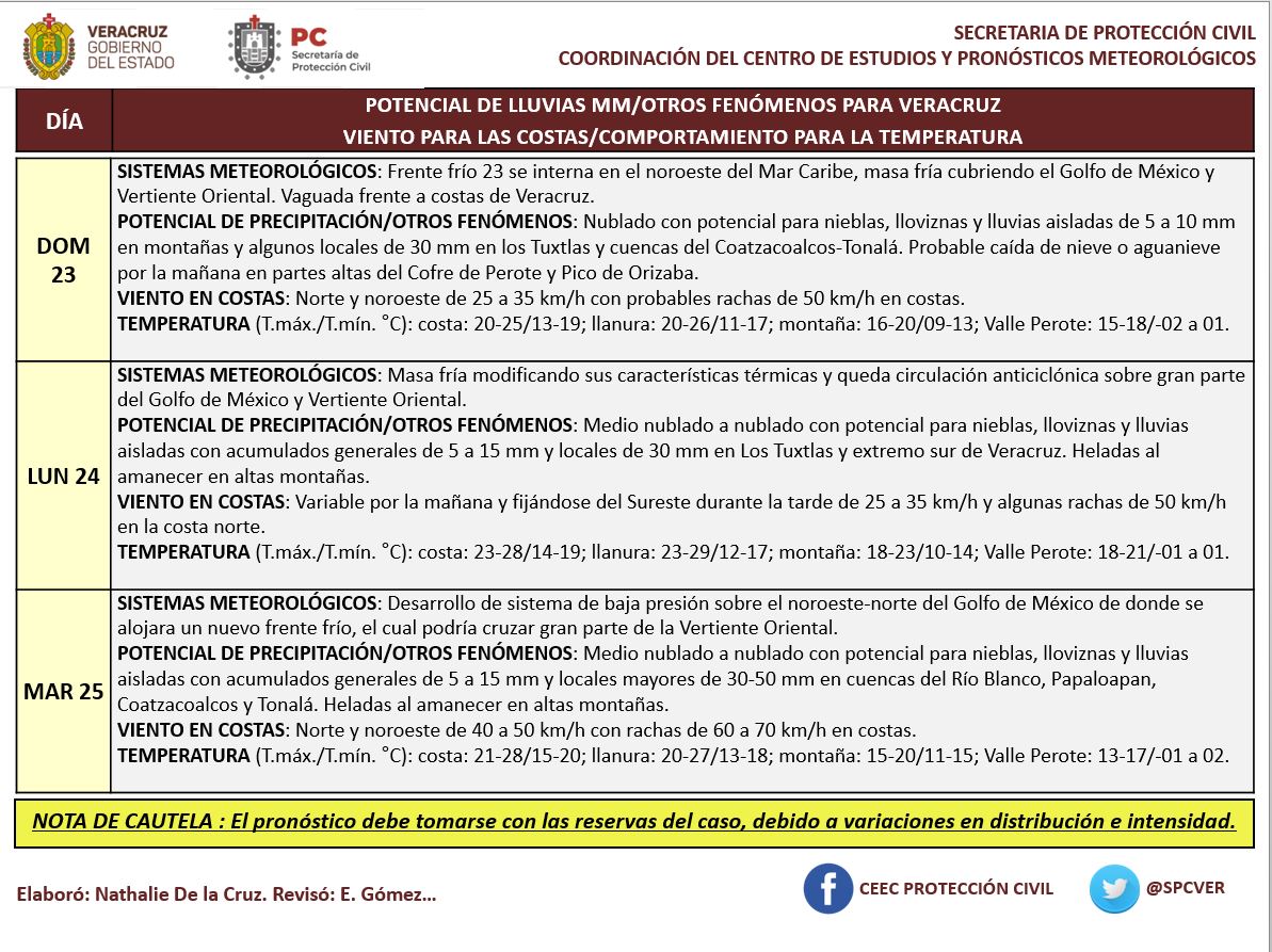 Este ocasionará nublados, potenciales de lluvias y probable caída de nieve y aguanieve en partes altas de Perote y Orizaba. También se esperan rachas fuertes de viento en costas de la zona conurbada Veracruz-Boca del Río.