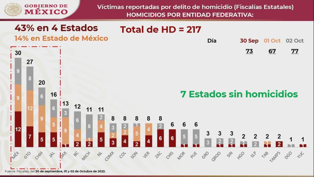 La información señala que entre el 30 de septiembre y el 2 de octubre de 2022 se reportaron 217 homicidios dolosos en todo el país.