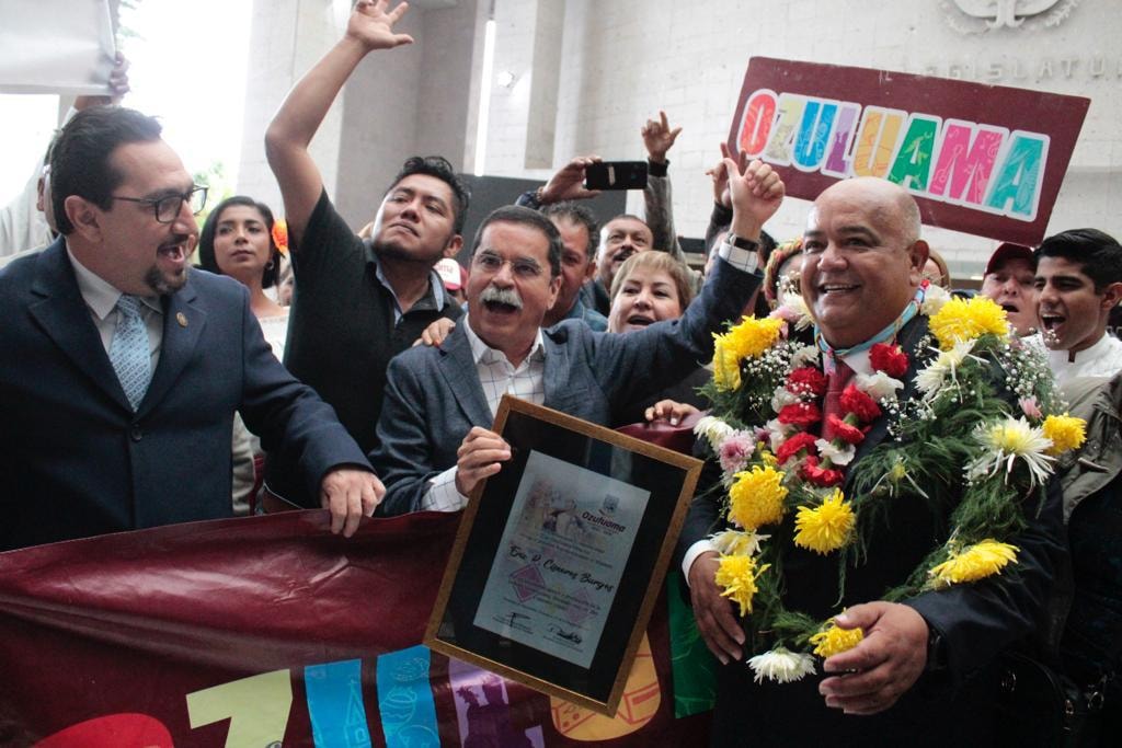 Al finalizar la comparecencia, los visitantes al Congreso, que se identificaban con gorras guinda con blanco y el nombre de su municipio de origen, rodearon la salida del Salón de Plenos para “echar” porras a Cisneros Burgos.