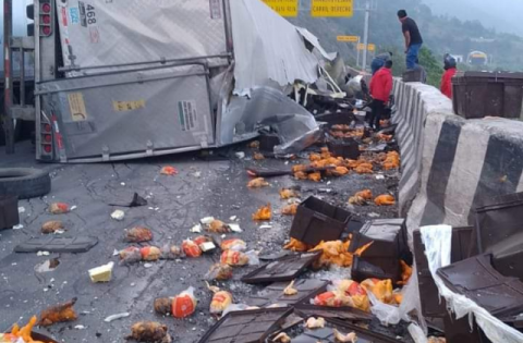 El percance se registró a la altura del kilómetro 232, cuando una unidad con caja seca refrigerada que llevaba un cargamento de pollos volcó al perder el conductor el control. Como es usual en estos casos, los rapiñeros fueron los primeros en llegar.