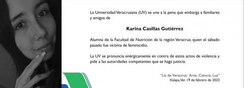 Veracruz, Veracruz.- En redes sociales, la Universidad Veracruzana lamentó el feminicidio que sufrió una estudiante en la región Veracruz. Se trata Karina Casillas Gutiérrez, de 25 años, perteneciente al programa educativo de Nutrición en la zona Veracruz- Boca del Río.