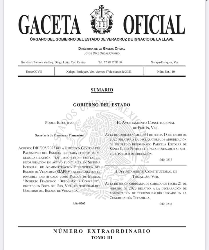 "Acuerdo DRI/005/2023 de la Dirección General del Patrimonio del Estado, que para efectos de su regularización en registro contable, incorporación en activo fijo y alta en sistema integral de Administración Financiera del Estado de Veracruz (SIAFEV), se declara que el inmueble identificado como parque de Béisbol Roberto Francisco "Beto" Ávila González, ubicado en Boca del Río, es propiedad de Gobierno del Estado".