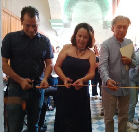 Autoridades municipales encabezadas por el director de Educación, Cultura y Deporte, Arturo Pimentel Murguía y Marisol Córdoba Castañeda, presidenta del patronato del Museo y La Capilla, acompañaron al autor en el corte del listón inaugural.