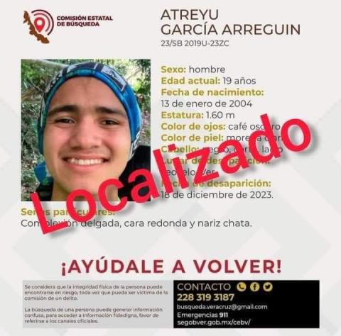 Xalapa, Ver.-El joven de 19 años, Atreyu García Marroquín fue localizado sano y salvo luego de haber permanecido cinco días en calidad de desaparecido entre los municipios de Teocelo y Jalcomulco, de acuerdo con información que proporcionaron sus familiares.